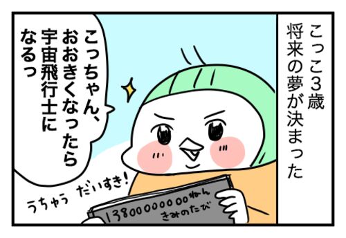 幼稚園の先生にはリスペクトしかない…… 将来の夢が決まったこっこ3歳。 「宇宙飛行士になって、宇宙に生地を持って行ってクッキーを作る。あと宇宙でみんなが長生きできる乳酸菌を作る」のと(宇宙でクッキー生地は作らないんだな)、そしてなんとなんと「…