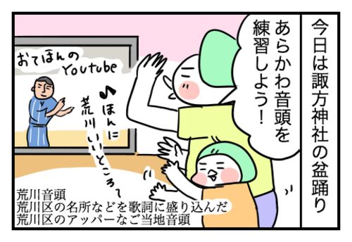 あとで夫は「みんなァ、どこ〜」と言いながらのんびりきた 7月末は西日暮里駅近くの諏方神社にて、納涼盆踊りがありました。 こっこは昨年3歳の夏にこちらの盆踊りに初参加して以来盆踊りにすっかり魅了され笑、荒川区の「あらかわ音頭」をがんばって練習…