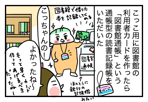 こっこはよほど気に入った本じゃないと「これは借りない」と本を棚に返してしまうので、図書館で10冊以上本を読んでも何も借りていかないこともしばしばなのですが、先日こっこ名義の図書カードを作ってみたところ「図書館通帳」なる読書記録アイテムをプレゼントにいただきました。