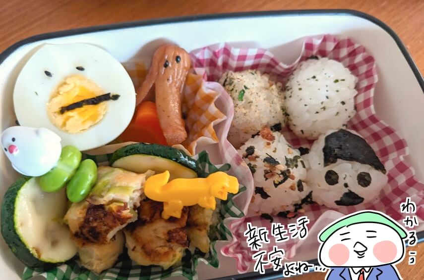 わたしもちょっと調子に乗って、アヒルやタコの顔や、こっこの顔のおにぎりを作ったりして精一杯のデコ弁にしてみました。夫からは「テーマは新生活への不安、ってかんじね。アンニュイなアヒルが」との評価。