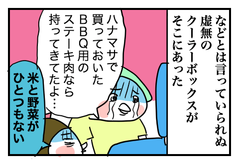 何かと人生に珍事件の多い夫ですが、「今回のキャンプこそは準備万全よ! 大丈夫よ!!」と自信満々で挑み、食材を忘れる大ポカをしました。さすが夫、裏切らない男。