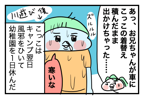 しかしキャンプから帰宅した翌日から風邪を引いて、幼稚園を1日休む羽目になったこっこ。