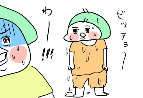 夫が顔面蒼白でコンビニに車を走らせ(キャンプ場から車で10分くらいのところにセブンがあった)、「カレーに使えそうなの、これしかなかった……」とけんちん汁用の野菜パックとレトルトごはんパックを買ってくるまでの30分ほど、夫がこっこの着替えを車に積んだまま出かけてしまったせいで、服がビッショビショのままだったこっこ。